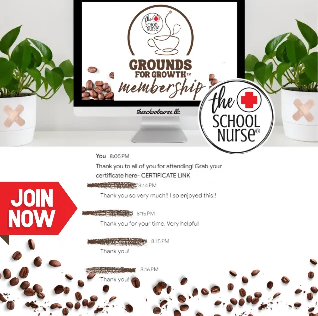 Join GROUNDS FOR GROWTH™, a private, supportive school nurse community offering connection, mentorship, resources, free CE courses, and confidence in your school nursing practice.